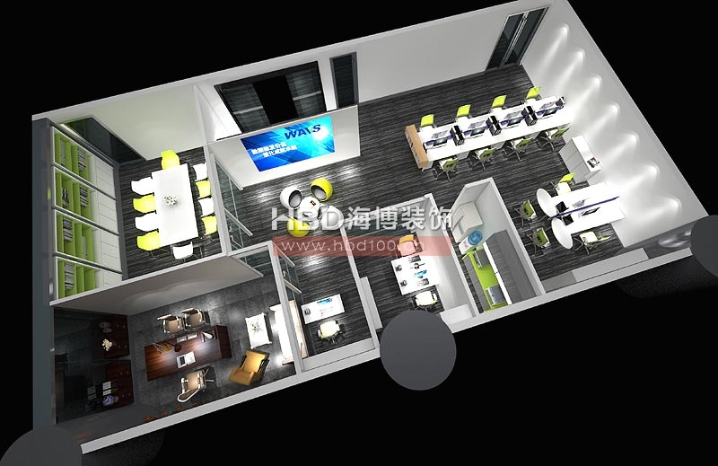 海博裝飾在設計中融入企業形象元素,蝴蝶雙飛給整體空間營造出一種清新脫俗的柔性美,辦公區采用高間隔進行功能區分,而地面統一采用灰色高級地毯,辦公桌椅均使用綠色元素裝點,充分展現出一個信息科技公司辦公室裝修的朝氣、熱情與創新。